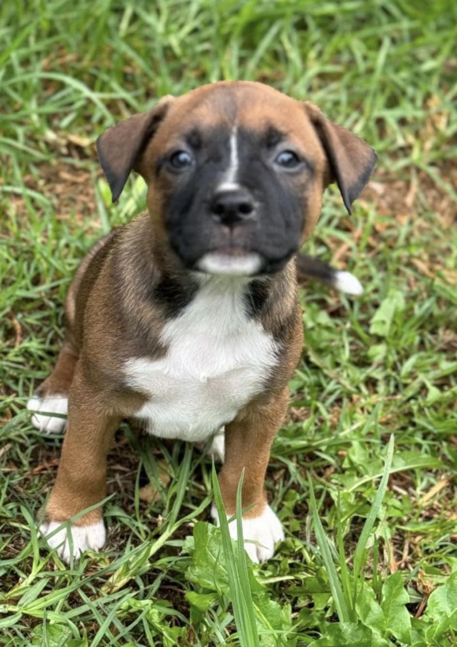 Mini ( Mummy) is a wee little English staffy x possible Jack Russell weighing around 16 kilos and Daddy is unknown but we feel the puppies will grow to a smaller med size based on their little stumpy legs