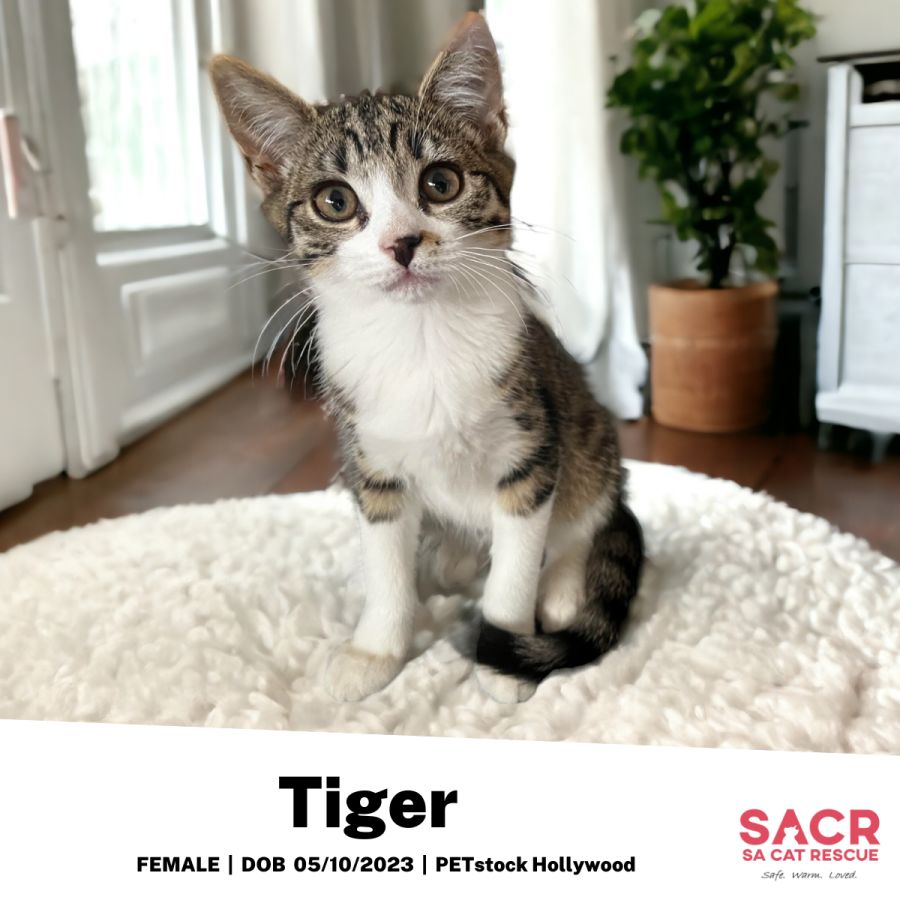 Tiger's adoption fee is $180 which includes desexing, microchipping, parasite prevention, and F3 vaccination.