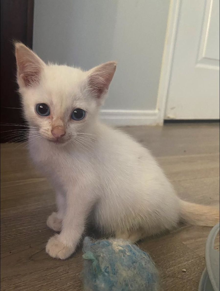 Gino is one loveable little man! He is the first to greet you in the mornings and loves to just follow you around. He has the most majestic blue eyes and has a white coat with the softest of golden feet and tail (we like to say he’s sun kissed!) He is a striking cat!