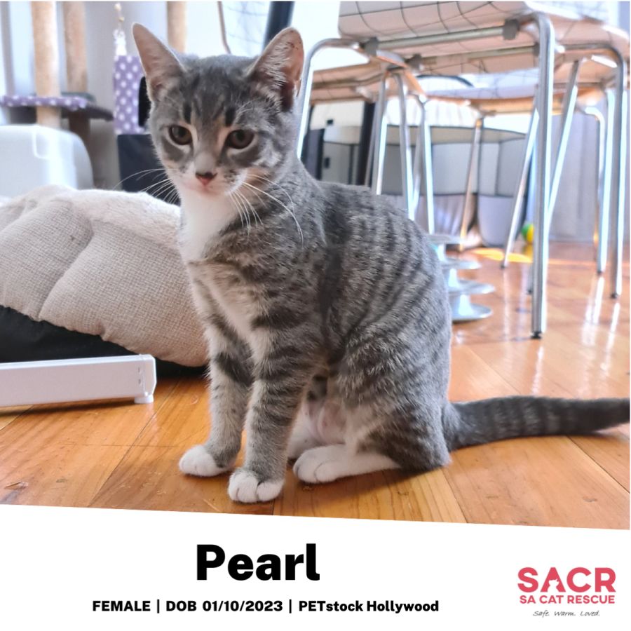 Pearlโs adoption fee is $180 which includes desexing, microchipping, parasite prevention, and initial F3 vaccination.