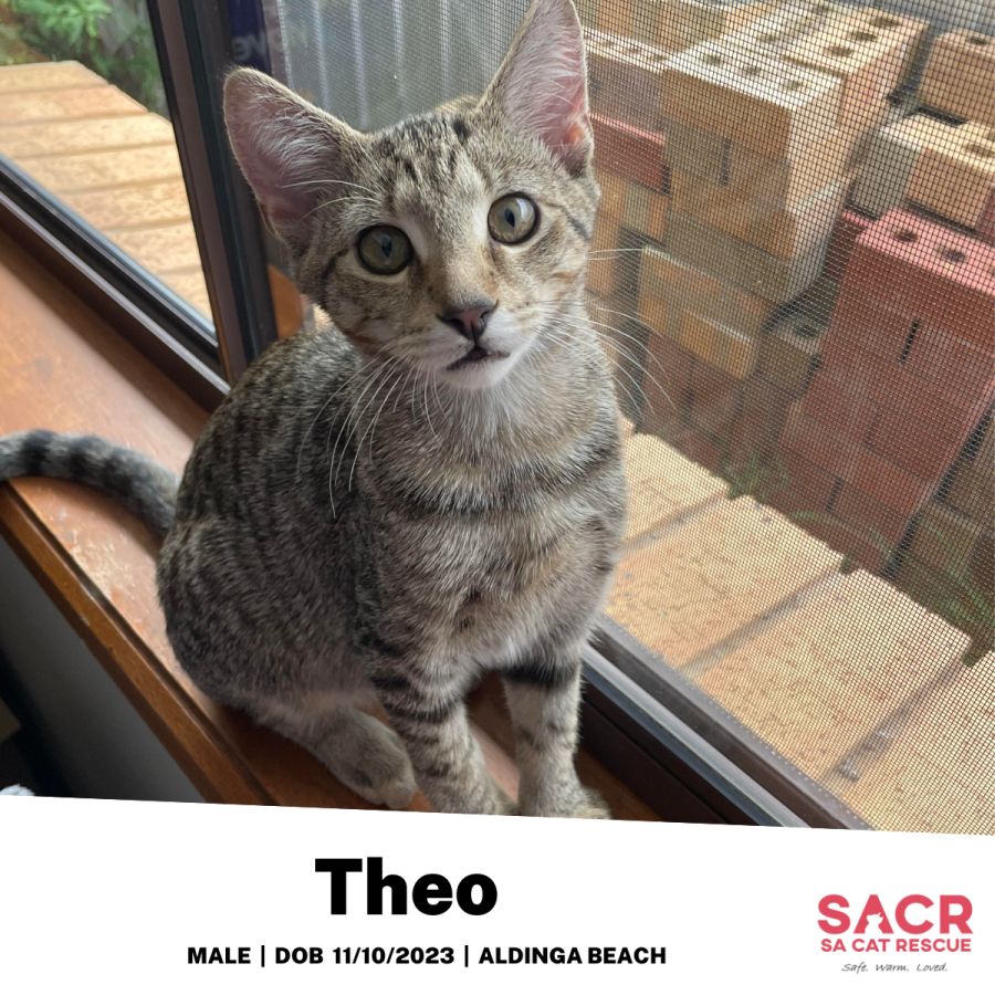 Theoās adoption fee is $180 which includes desexing, microchipping, parasite prevention, and initial F3 vaccination.