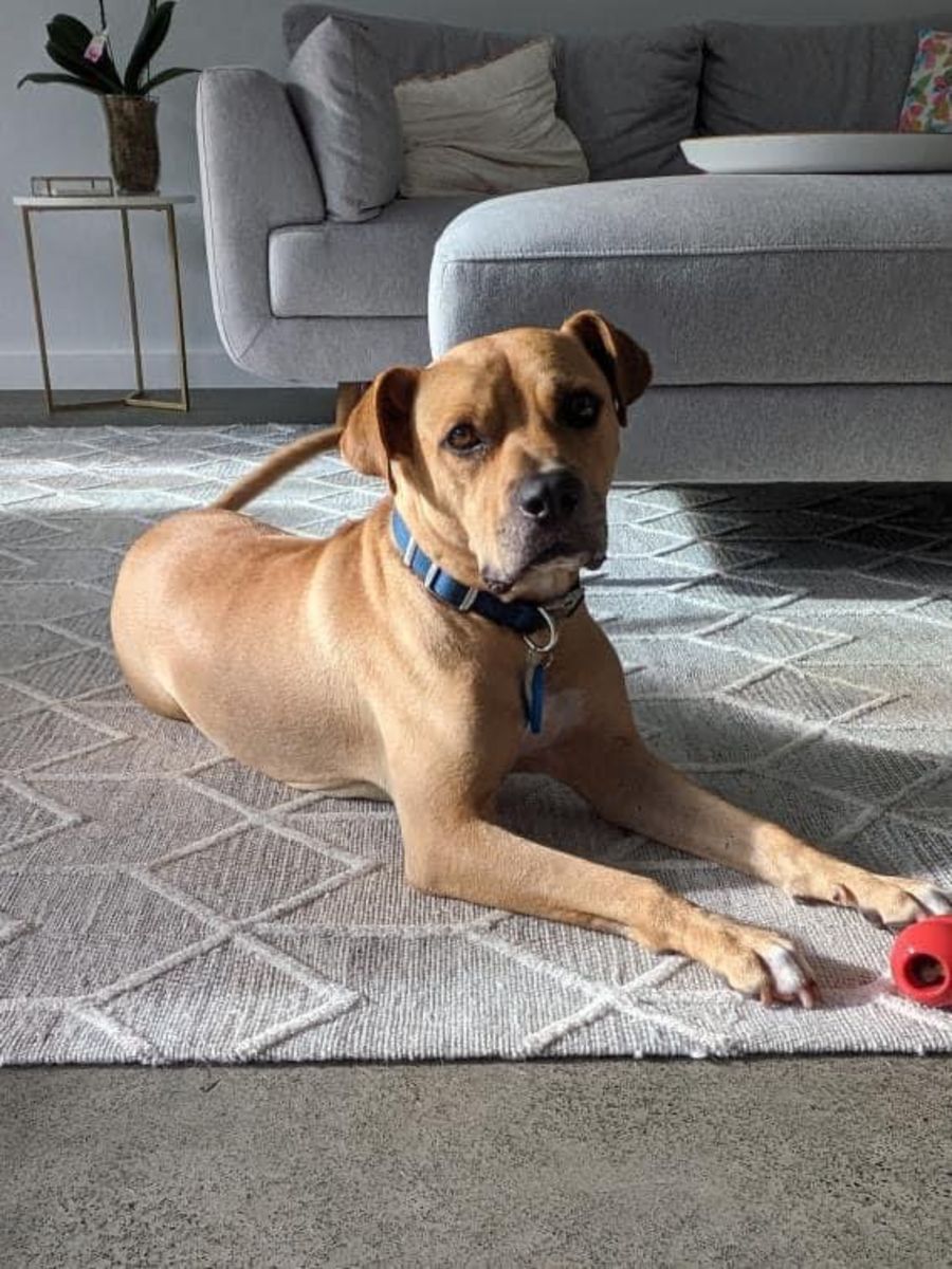A bit of a goof-ball, Butch will toss his toys in the air and scamper after them, or roll around on the floor looking for belly rubs. He can get boisterous when excited, so should be supervised around young children. He has lived with children and pets, including dogs, cats, a goat and a horse!