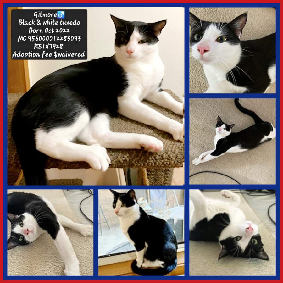 Gilmore has grown up in foster care surrounded by cats and kittens of all ages and loves to romp and play with them until his batteries run out.