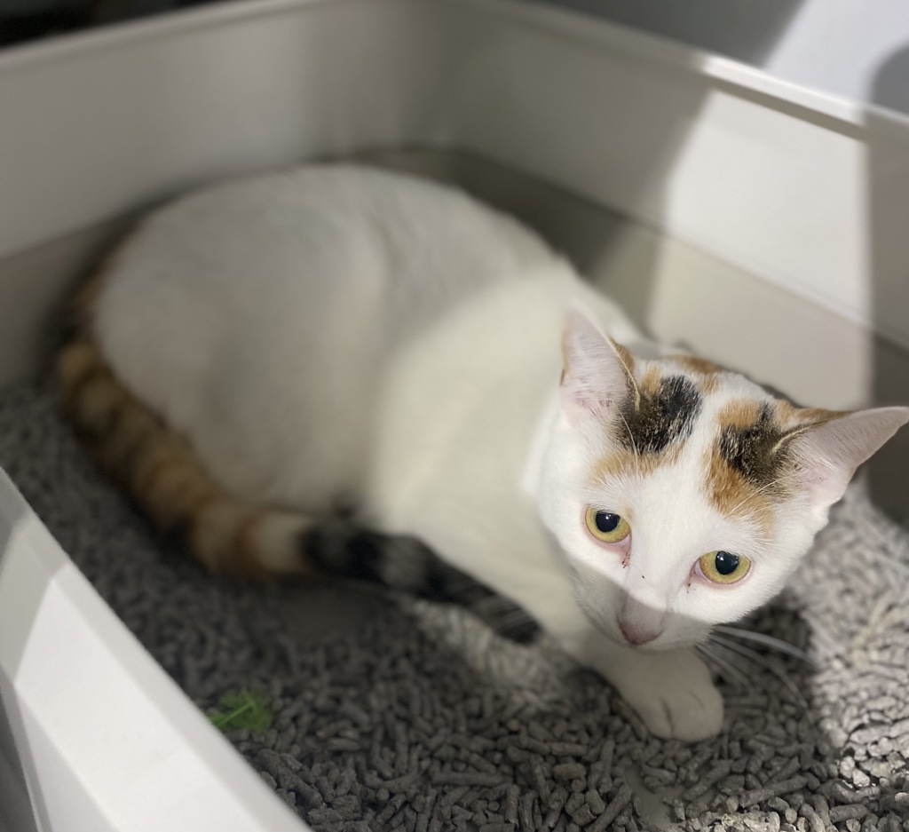Rhubarb is an adorable calico and white kitten with a playful and affectionate personality. She absolutely adores receiving pats and cuddles from her favorite humans.