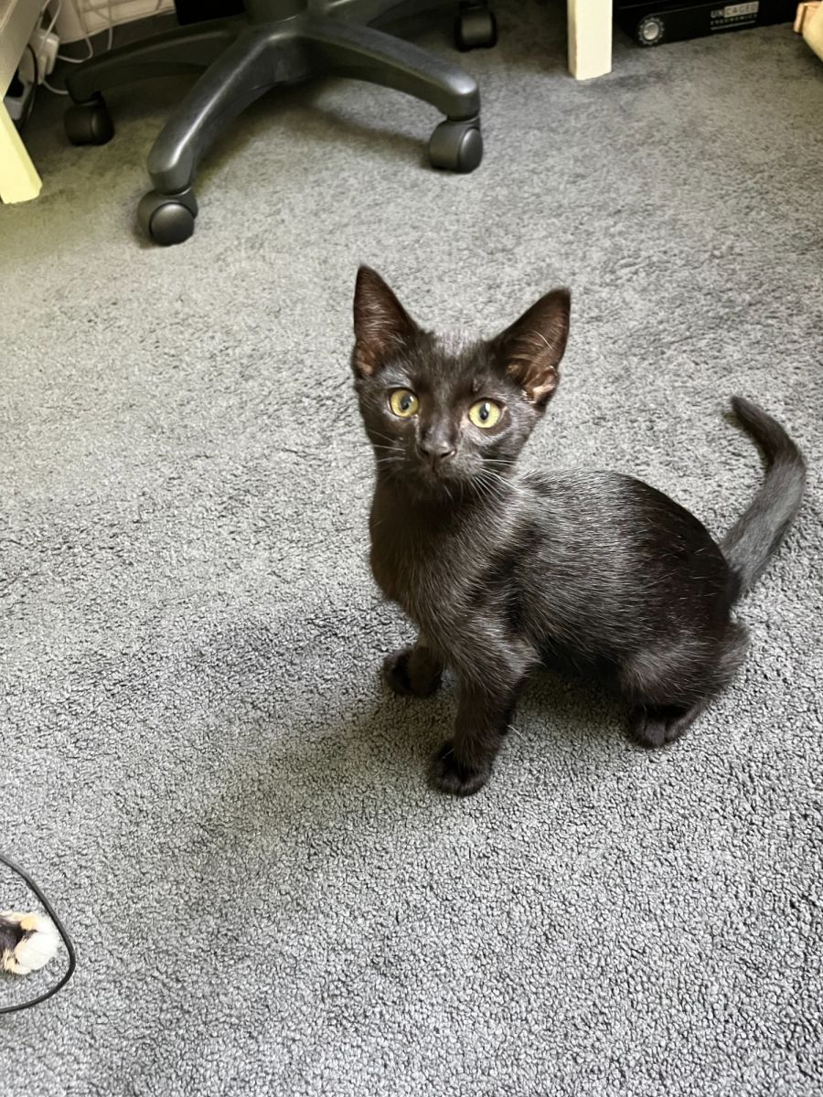 Shadow is a beautiful night-coloured boy - sleek and tall, with a long tail and strong face. All the signs are that he'll be a very handsome fellow when he grows up!