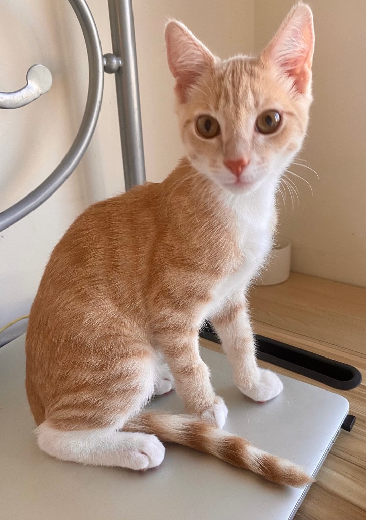 Percy Perfectpaws was born in care with CPoM to an abandoned mother, this little champagne tiger almost died from giardia (gut infection) but he's a fighter as you can see. It's left him with a lithe frame and big appetite. Percy loves to curl up with his carer at night, get stroked and scritched, as well as running all over the house playing. He's a sweet boy that chirps and purrs easily, and he's been a delight to foster. He can be a bit highly strung (we jokingly call him the Drama King) and would not be suitable for a busy noisy household, but would be perfect for a quiet one that has the occasional gathering.