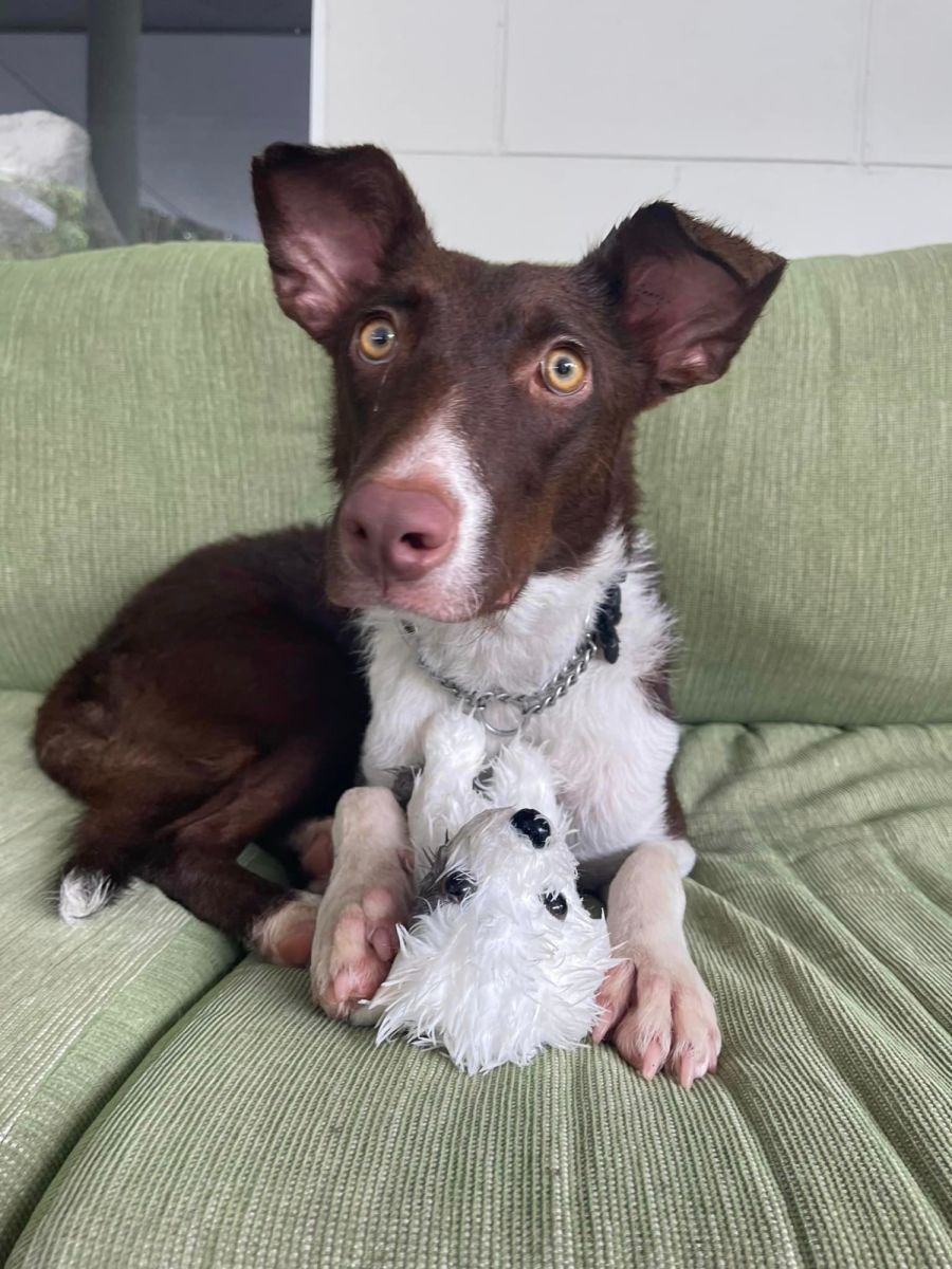 Bounce doesnt mind sleeping her crate and you don’t hear a peep from her until get up time in the morning. Bounce is food focused making training her a breeze. Bounce is good on lead as well. She really is a good all round girl.