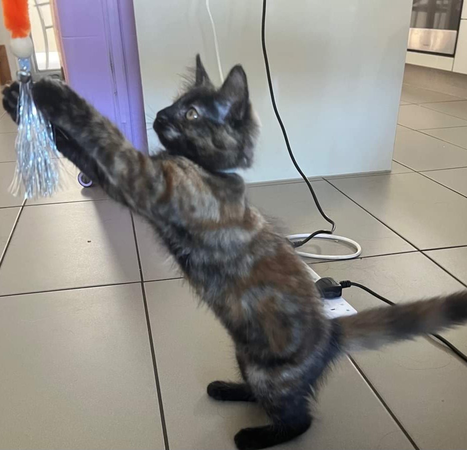 Cagney is a very playful girl with boundless energy. She doesn't like being left alone, and would be great in a family with kids or if adopted together with another kitten. She's ok with being picked up but will zoom off to play after a quick cuddle. She is ok with pats on her body. She loves to play and explore and is a really brave kitty!
