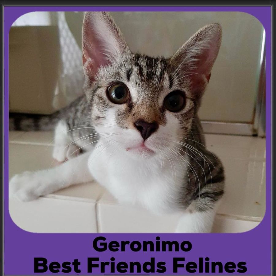 Geronimo is a sweet kitty with a great ball of energy that loves to play with other cats and his humans. During the day when tired he will find a great hiding place snuggled up with his best friend Daria. He will seek you out for some affection on his terms. He is happy, playful and interested in everything around him. He loves to scamper and join in on activities in the house.