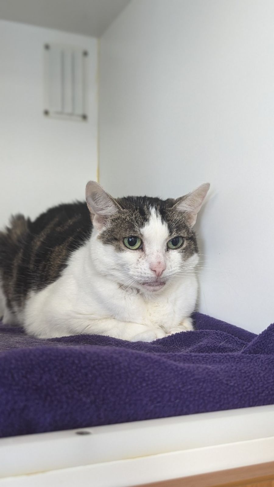 Meet Lucy, a sweet senior lady who'll steal your heart with her endearing croaky meow. Lucy's a bit on the shy side, seeking a quiet environment where she can thrive.