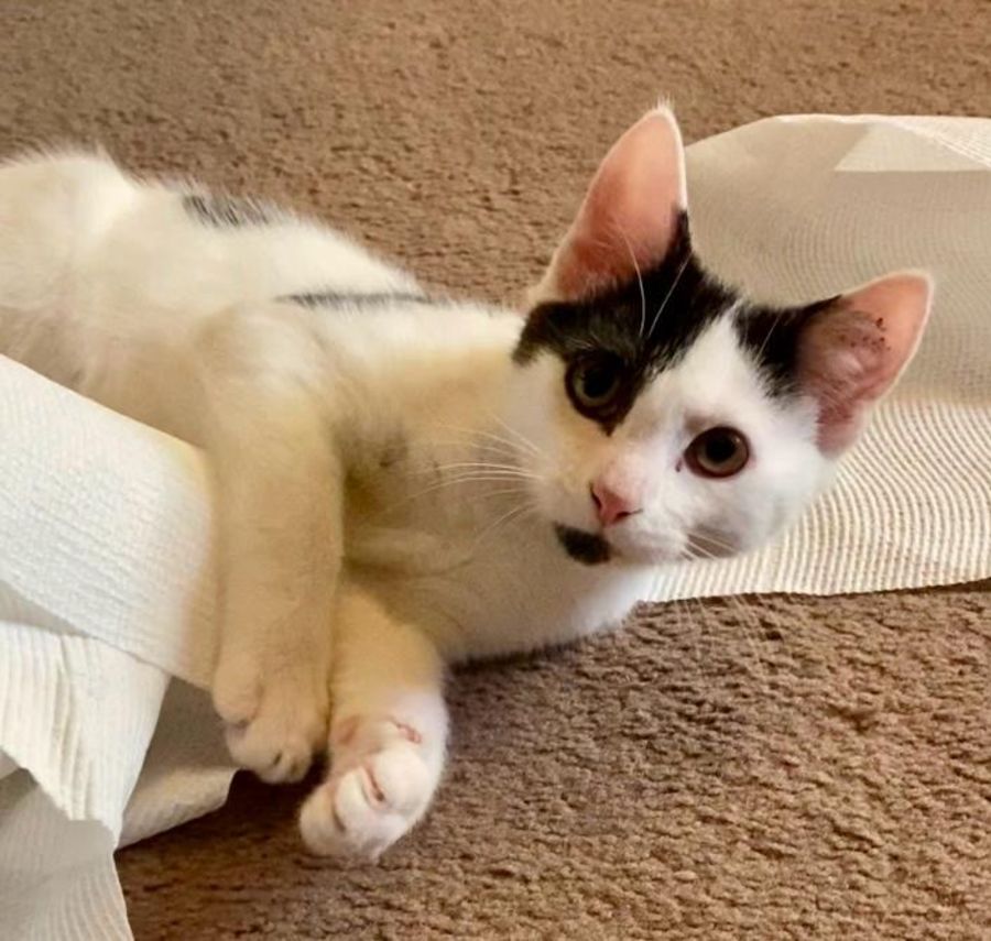 His interaction with kids and other cats is astonishing; he loves to play with them and enjoys their company. As a curious kitty, he loves to explore and learn new things. He's also brimming with striking cow-like markings, a delightful addition that gives him a distinctive, adorable look.