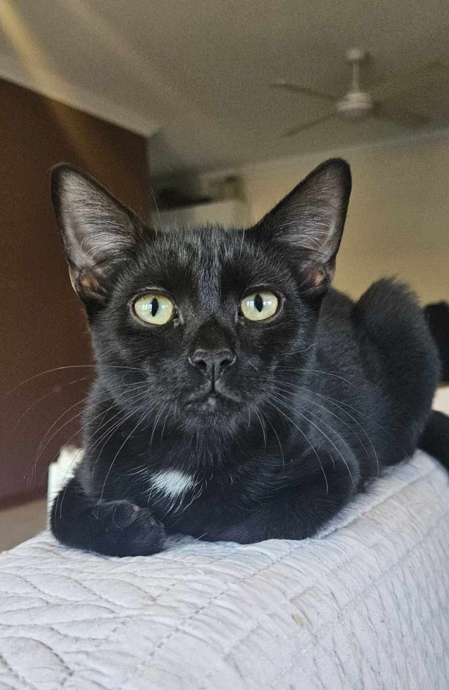 Appearance: I'm a sleek and handsome little guy with velvety black fur that's sure to capture your heart. My unique white chest spot adds a touch of individuality to my overall adorable appearance. (I am very proud of it because all my siblings are straight black, it helps me stand out from them).