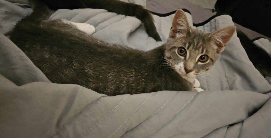 Meet Molly, a delightful 16-week-old female kitten with a heart as warm as her soft, gray fur.