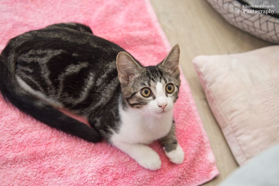 Socks is fine with my kitten tolerant cats and kitten tolerant dog and is first to welcome new arrivals into care.