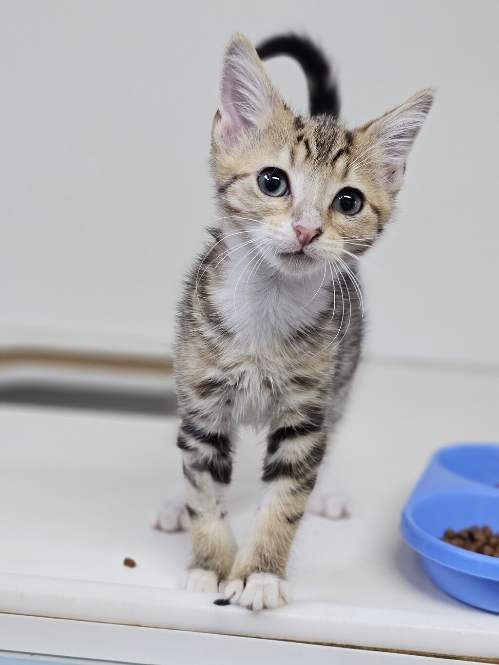 Hey there, I'm Triok. I'm a friendly and affectionate kitten who would suit most homes! My playful paws are always ready to pounce on anything that moves. I love playing with wand toys and mysterious shadows on the wall! When I'm finished playing, I love nothing more than finding a warm lap to curl up in.