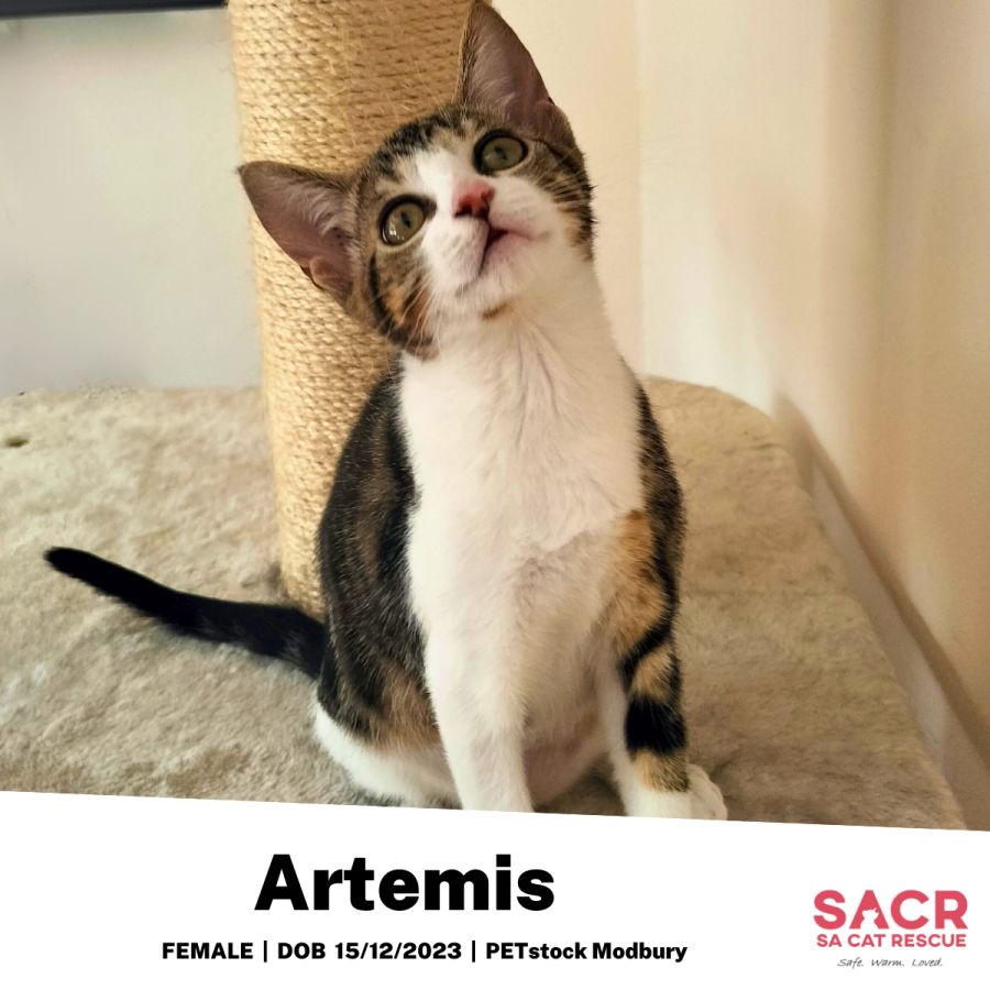 Introducing Artemis, a petite and pretty feline friend full of vibrancy and life. Her playful charm mixed with a lively disposition is certainly a joy to experience.