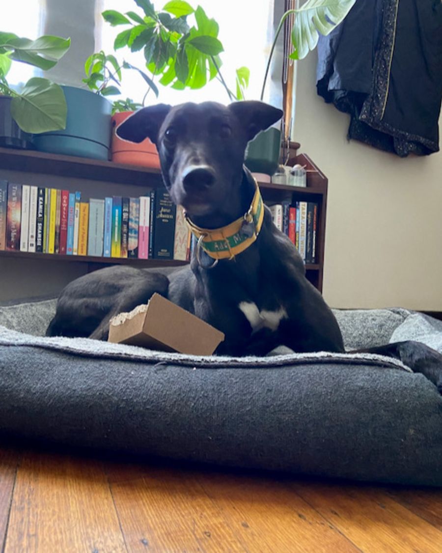 Fonzie was lucky enough to never have to raced and thankfully has found a very loving foster home to help him learn to be a cherished family member. Fonzie gets along very well with a greyhound sibbling but is also happy being an only dog. Fotunately his foster Dad works from home. They keep each other company during the day while the human works and Fonzie naps. On occassion Fonzie has been lucky enough to go to work in the office where he can enjoy all the human attention as they give him lots of cuddles and positive performance reviews. Fonzie is happy to settle on his bed, watching them do all the work. He could be in management. Fonzie is currenly living in a high rise apartment in the city so is an expert at stairs and elevators. He enjoys all the action of city streets.