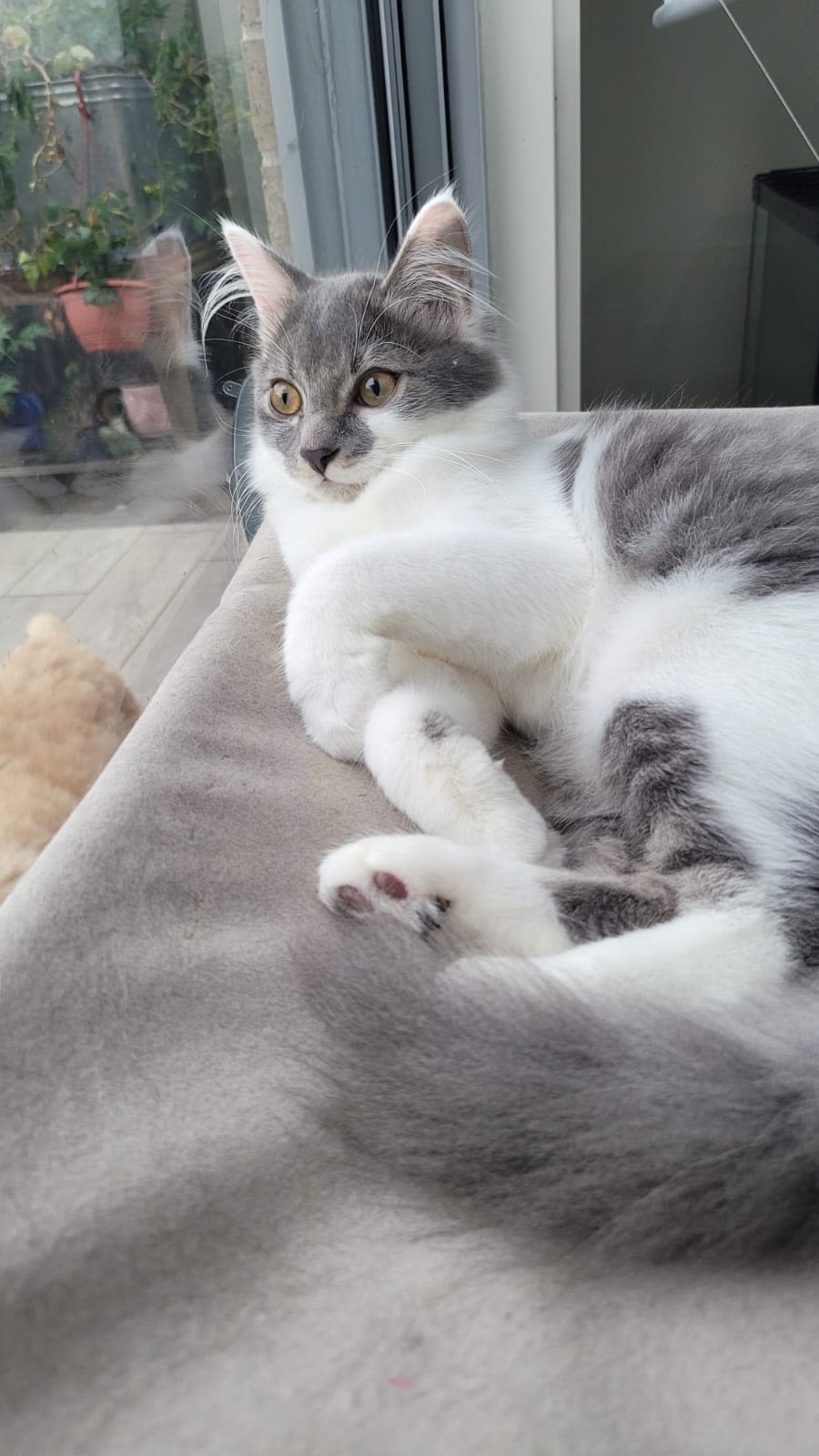 This charming long/medium-haired wonder boasts a coat of fluffy white and grey. Bell's not just a pretty face, though! He's an avid adventurer, always ready to chase down any feathery toy, bouncy ball, or even rogue dust bunny that crosses his path. Prepare for playful "victorious" growls when he declares his conquest! But the fun doesn't stop there. Bell has a unique talent for "redistributing" his toys (and maybe your hair scrunchies) by carrying them triumphantly from room to room, claiming everything he deems worthy!
