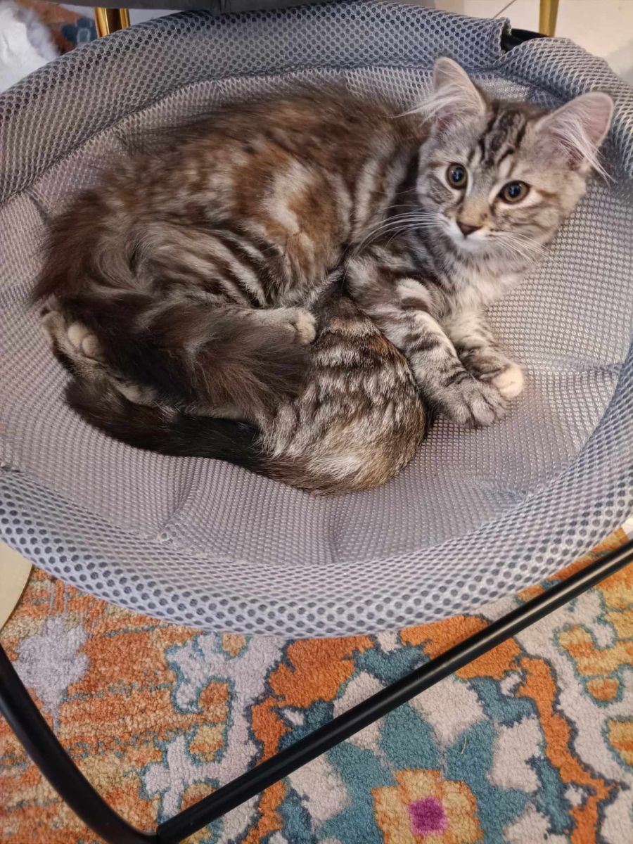 Incredibly social little girls with no health issues, Nimbos is a medium domestic hair with the most gorgeous blends of grey, white, brown and red stripes and spots.