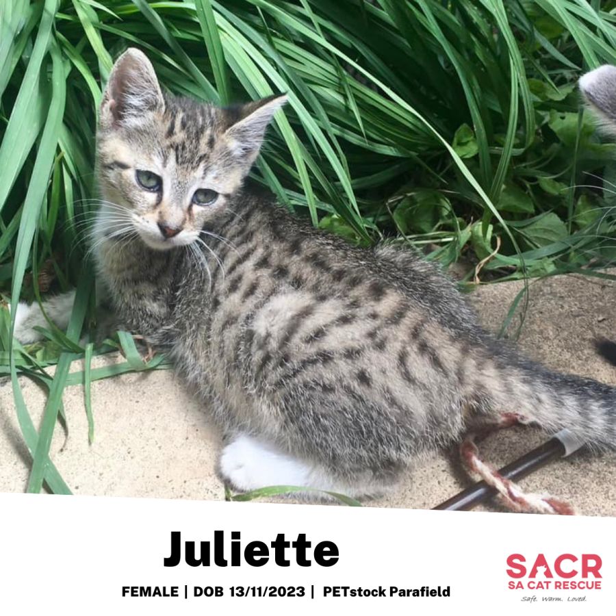 Julietteโs adoption fee is $180 which includes desexing, microchipping, parasite prevention, and initial F3 vaccination.