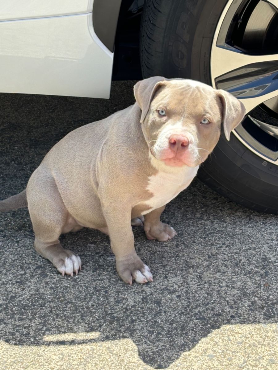 Storm is a beautiful American bully - bought from a breeder however owners were not equipped for a dog. He was thought to have been blind however we have had checked and he can see just lower vision- unfortunately with these colour dogs this can sometimes happen.