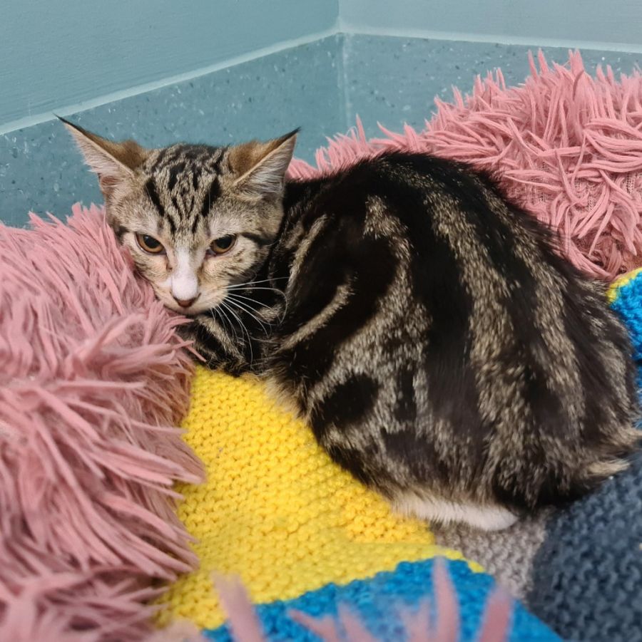 Her ideal day begins with some gentle cuddling, followed by exploration and a fair share of sleep. Preferably, her new family will have patience and understanding, giving her the time to adjust and blossom into the friendly kitty she can be.