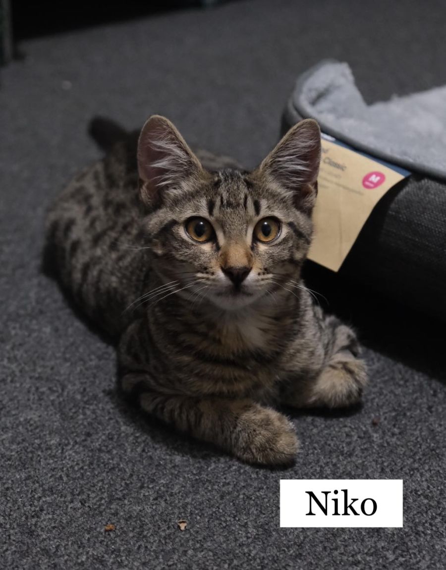 Niko is a curious little guy, always up for some fun and games. He’s super friendly and loves a good back massage and belly rubs. Niko has a really chill vibe. He loves hanging out with his sisters Mimi and Cleo and he is a bit of a mummy’s boy, and has a soft spot for worm shaped toys and his bell balls.