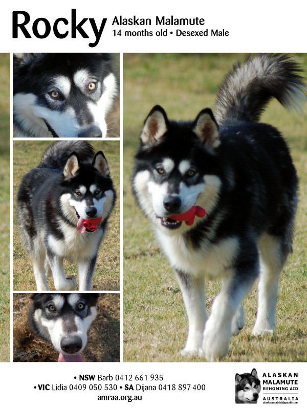 Rocky is a big and handsome, energetic, very playful and bouncy 1 yr old malamute boy who loves chasing the ball (and even brings it back most of the time), has basic obedience training, loves his chest rubs and cuddles and allows full handling without issue. However, he needs an experienced mally owner who is a firm but gentle leader and willing to commit to ongoing obedience and lead training. He is currently receiving obedience training and is very, very bright, responding well to positive reinforcement. Like a lot of malamutes he is variable with other dogs and would need careful introduction. Rocky would be unsuited to rehoming with cats or pocket pets due to his exuberance and size. High, strong and secure fencing would be required. If you are interested in adopting rocky please visit our website at www. Amraa. Org. Au and complete our online adoption application