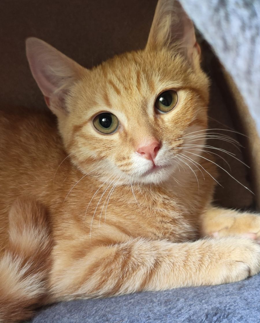 Mr shy guy loves being with his siblings and is a real cats cat. Pepper loves to play, but is still learning to be confident around humans. Pep loves having a nice cozy spot to nap though and can be found snoozing contently.