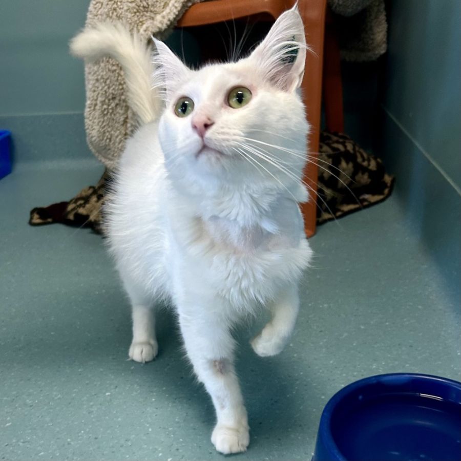 In his former life, he has lived with another cat. Consequently, he may be able to adjust to existing pets in the household, as long as proper introductions are made ensuring everyone gets along. However, he will need to be an indoor cat due to his white coat.