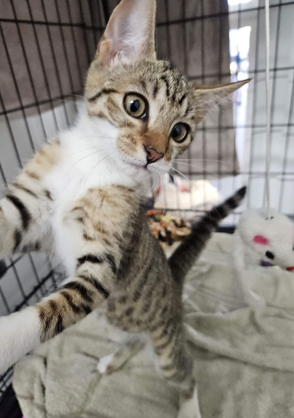 Cattie will steal your heart with her huge purr and her offer of kitten kisses. She absolutely loves games and will play with anything that moves. She's partial to anything with feathers.