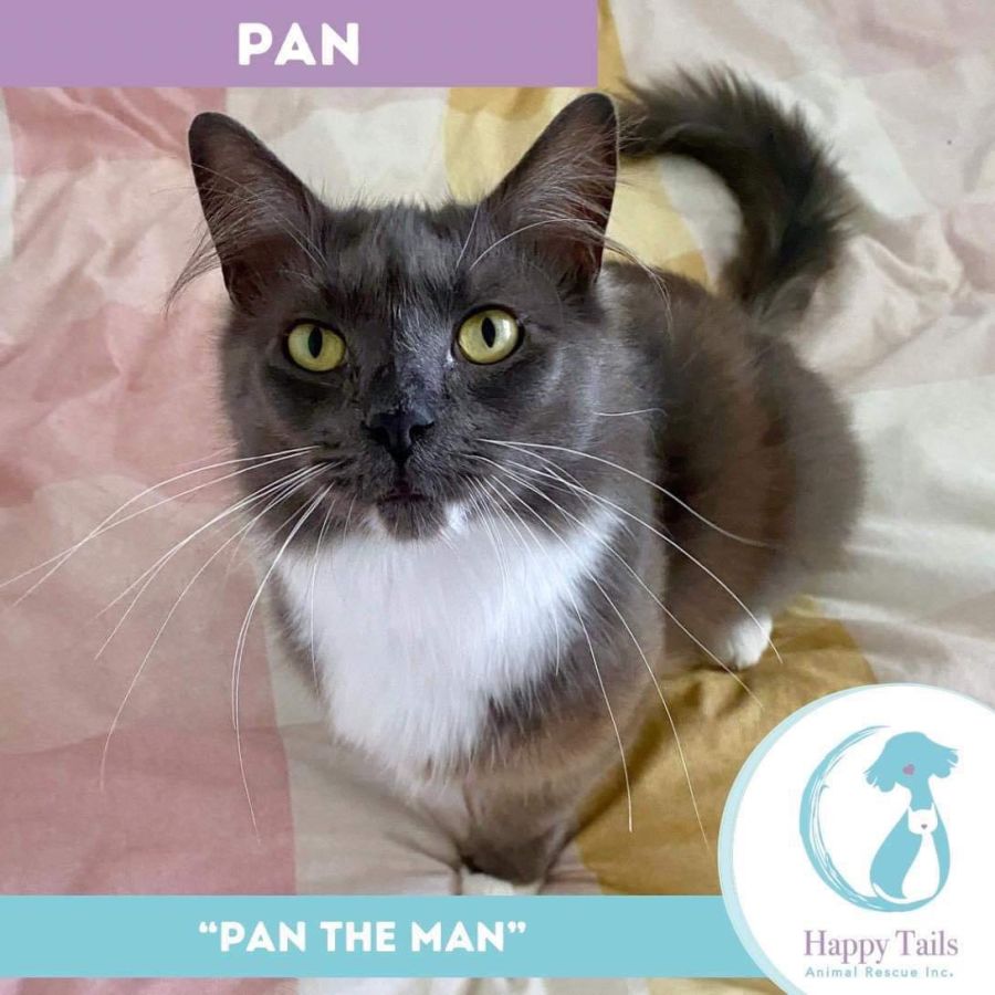 Pan gets along well with his cat foster siblings, and will sometimes play with the younger ones. He’s very docile with the cats, but he’s not a fan of the dogs and would best suit a dog free household.