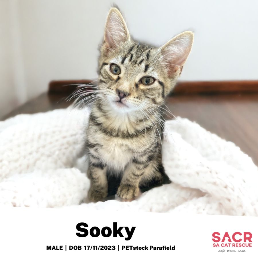 Sooky's adoption fee is $180 which includes desexing, microchipping, parasite prevention, and F3 vaccination.