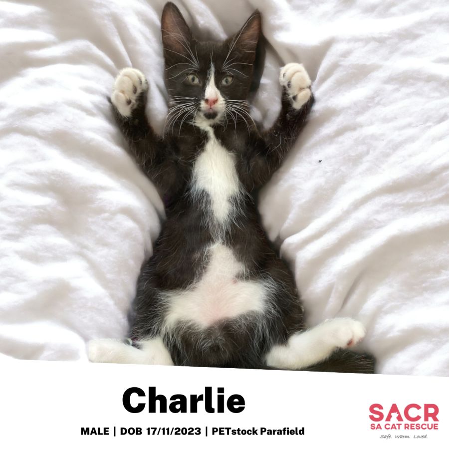 Charlie's adoption fee is $180 which includes desexing, microchipping, parasite prevention, and F3 vaccination.