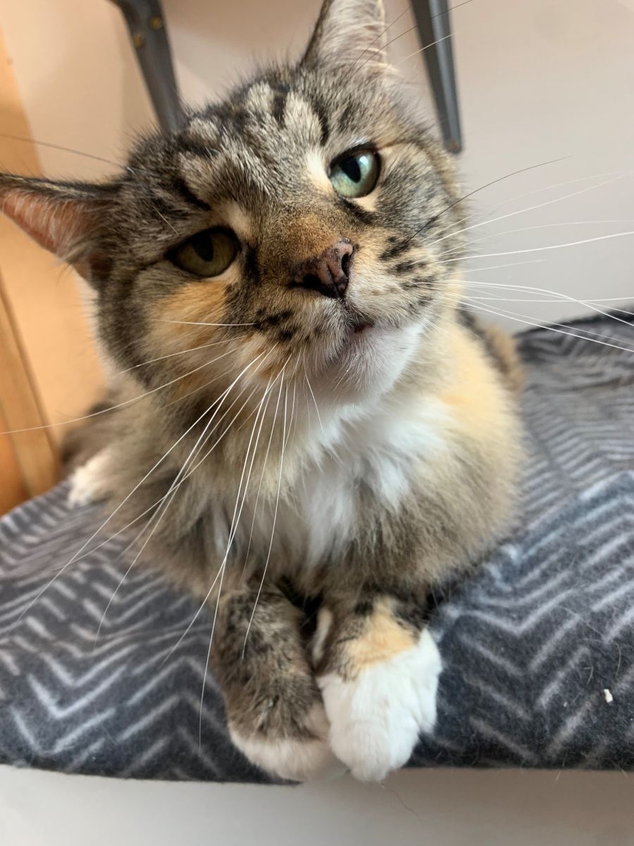 Her previous owners equally described her as playful and affectionate. She loves playing with wand toys but also enjoys curling up next to you for a nap! Kindle has had children in her life and can tolerate them if they don’t invade her space and let her come to them!
