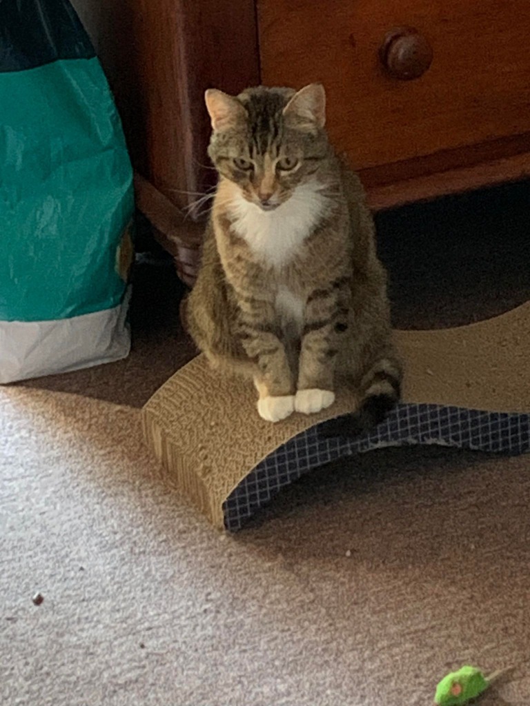 The lovely Skits knows what she wants and will let you know with a croaky meow. She loves head scratches and will reward your attention by turning on her purrs once she’s got what she wants. She is not a lap cat but does want to be near you and will settle tucked up beside you given the chance.