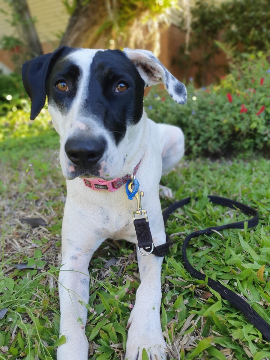 I love food, riding in the car, and going on walks. I also have fun running around in the backyard with my foster brother. We sleep together inside, and he's teaching me how to use the doggy door.
