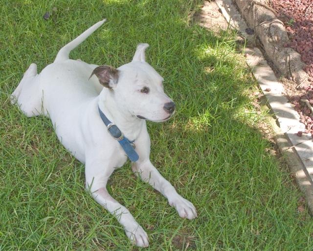 Ellie is a happy, friendly youngster who adores people and loves to play rope-tug and chasey with other dogs of all sizes. She is a short-coated white dog with one brindle ear, which gives her a beautiful appearance. Ellie walks nicely on-lead and has a reliable sit. She is still an adolescent though and will benefit from further training to learn patience and self-control of her eagerness to give cuddles!