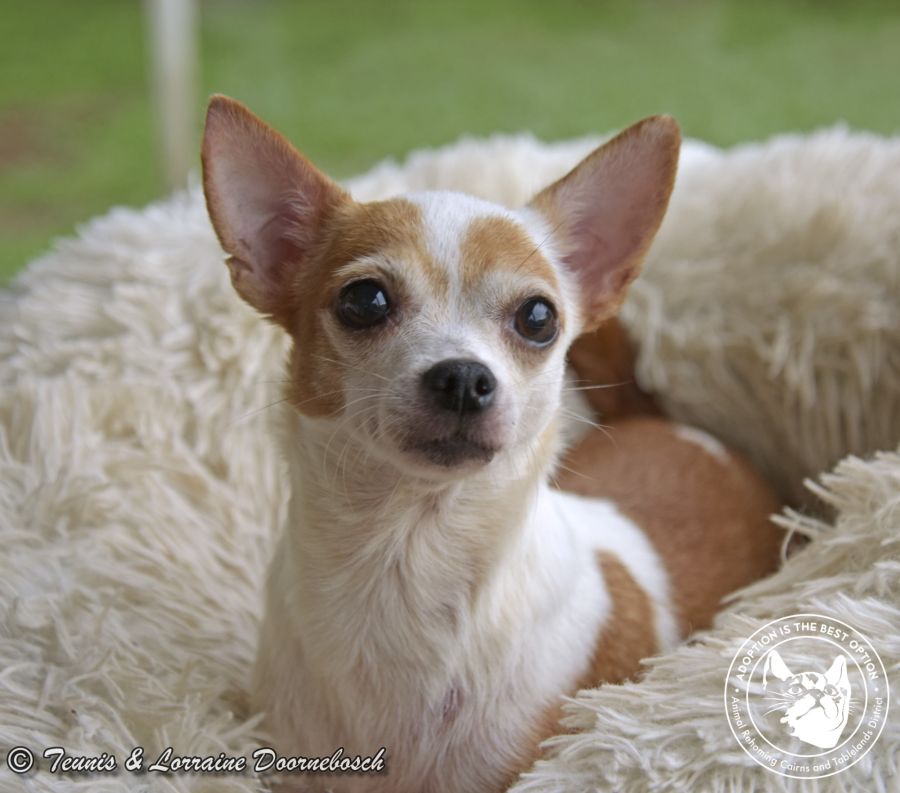 Zha Zha is one of the sweet little Chihuahua girls that were "old breeding stock" surrendered to us on their retirement. Zha Zha is very friendly and not at all shy with strangers. The breeder was unable to tell us how old she is, but she appears to be a bit older than Sooty but, that might just be her temperament. She is quite content to laze around most of the day and is not interested in play. She would be very suitable for an older person who would love a lap dog or a quiet family. Zha Zha has obviously had many litters and is worthy of being treated like the lovely retired Queen that she is.