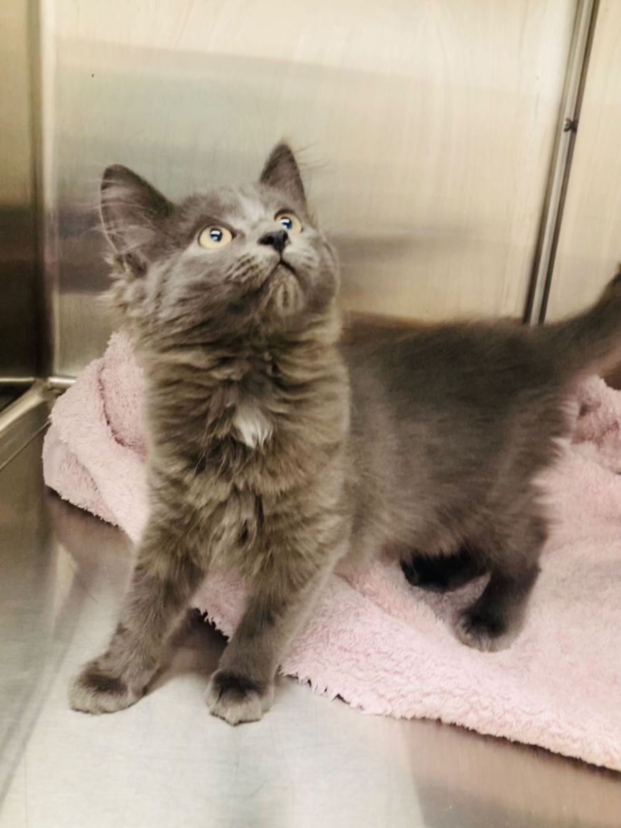 Meet Smokey, a stunning grey kitty that's sure to take your breath away. Smokey has a real magnetic appeal, with a sleek, soft coat in a shade of beautiful grey that captivates everyone. This handsome hotshot really knows how to melt hearts!