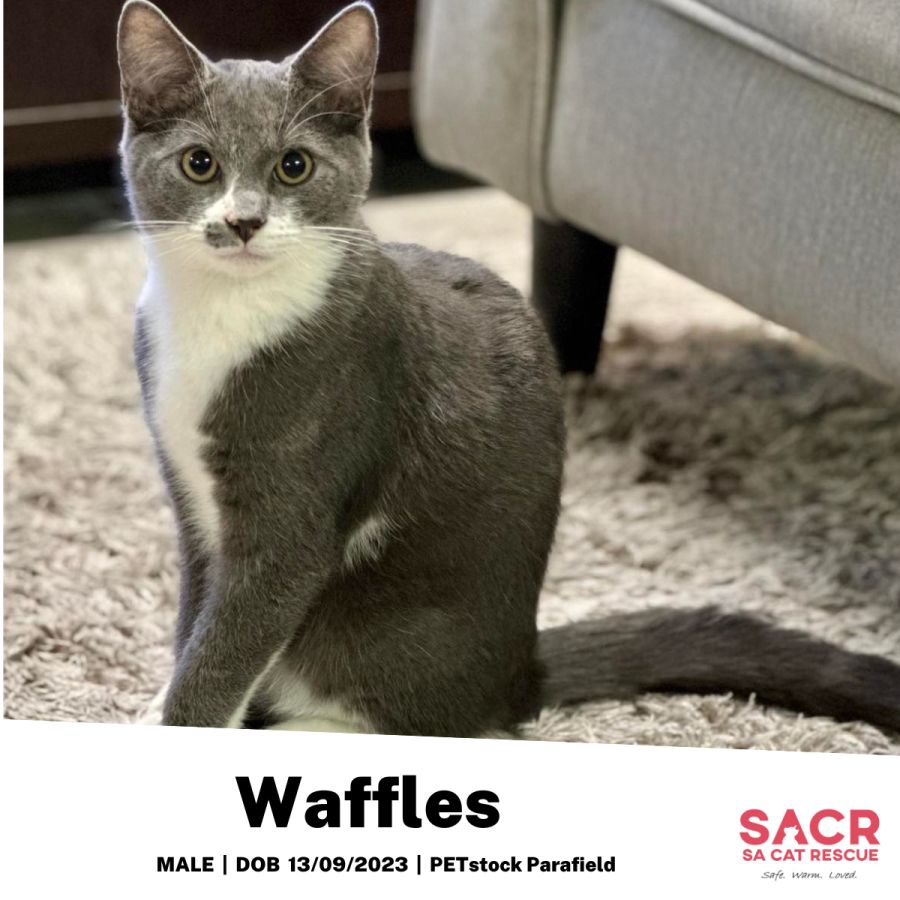 Waffles' adoption fee is $180 which includes desexing, microchipping, parasite prevention, and F3 vaccination.