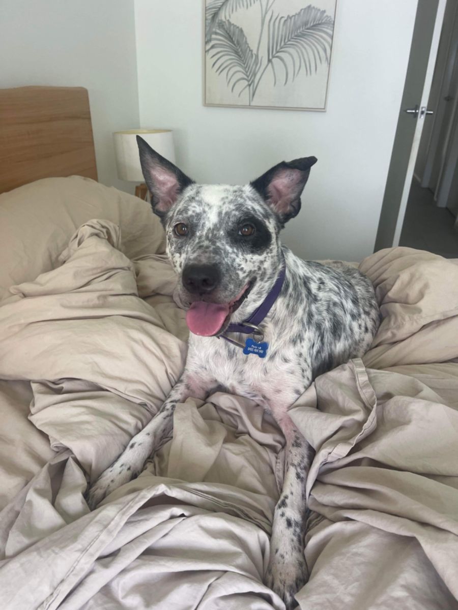 Scout is a beautiful dog and an absolute cuddle monster! She loves people and just wants to be with you all the time! She loves to follow you around the house and lay at your feet or cuddle up to you on the couch or bed. As soon as she sees a new person on a walk she starts wagging her tail excited to make a new friend. She is very people focussed and loyal. She also loves pillows! It doesn’t matter how small one is Scout will try to perch atop it 😂 Scout is a confident girl who gets along fine with other easy going dogs and is currently in foster care with another dog who she gets along well with. She isn't a very active dog, only requiring a walk a day and then she is happy to snooze on the lounge or near her humans.