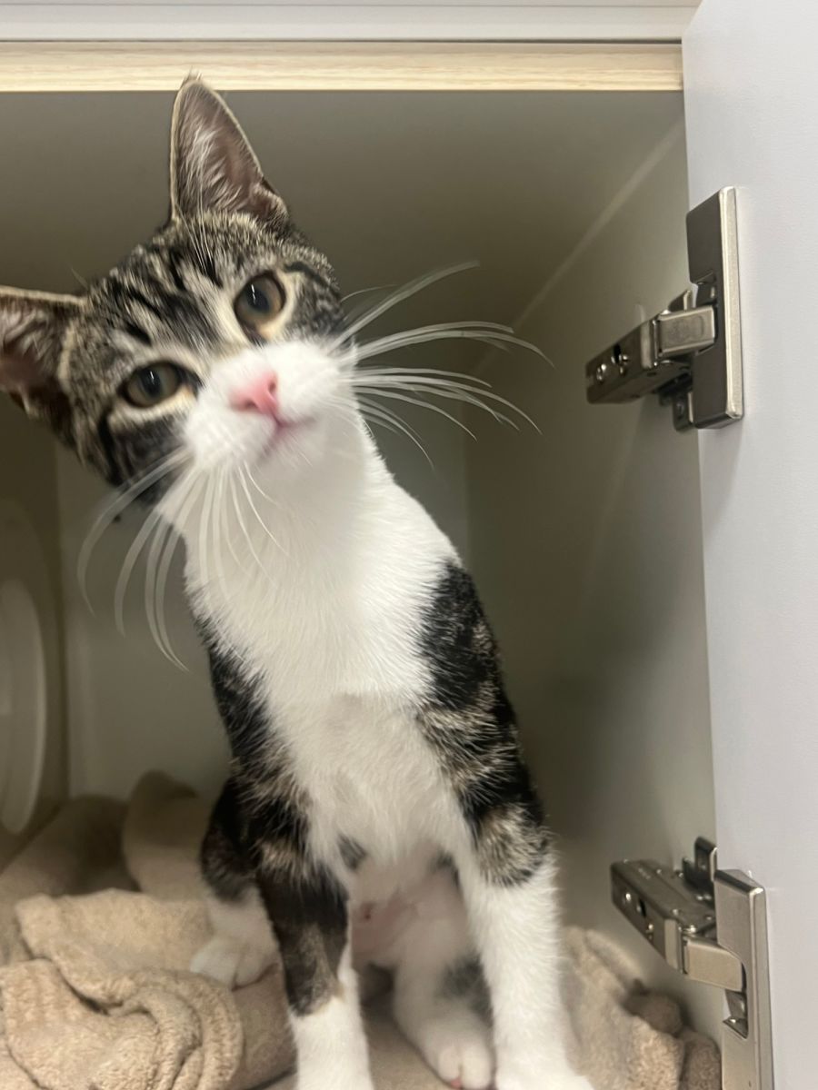 She is a confidant and friendly kitten, great with other cats, good with children and although she hasn't been around a dog, we don't think there'll be any problems there.