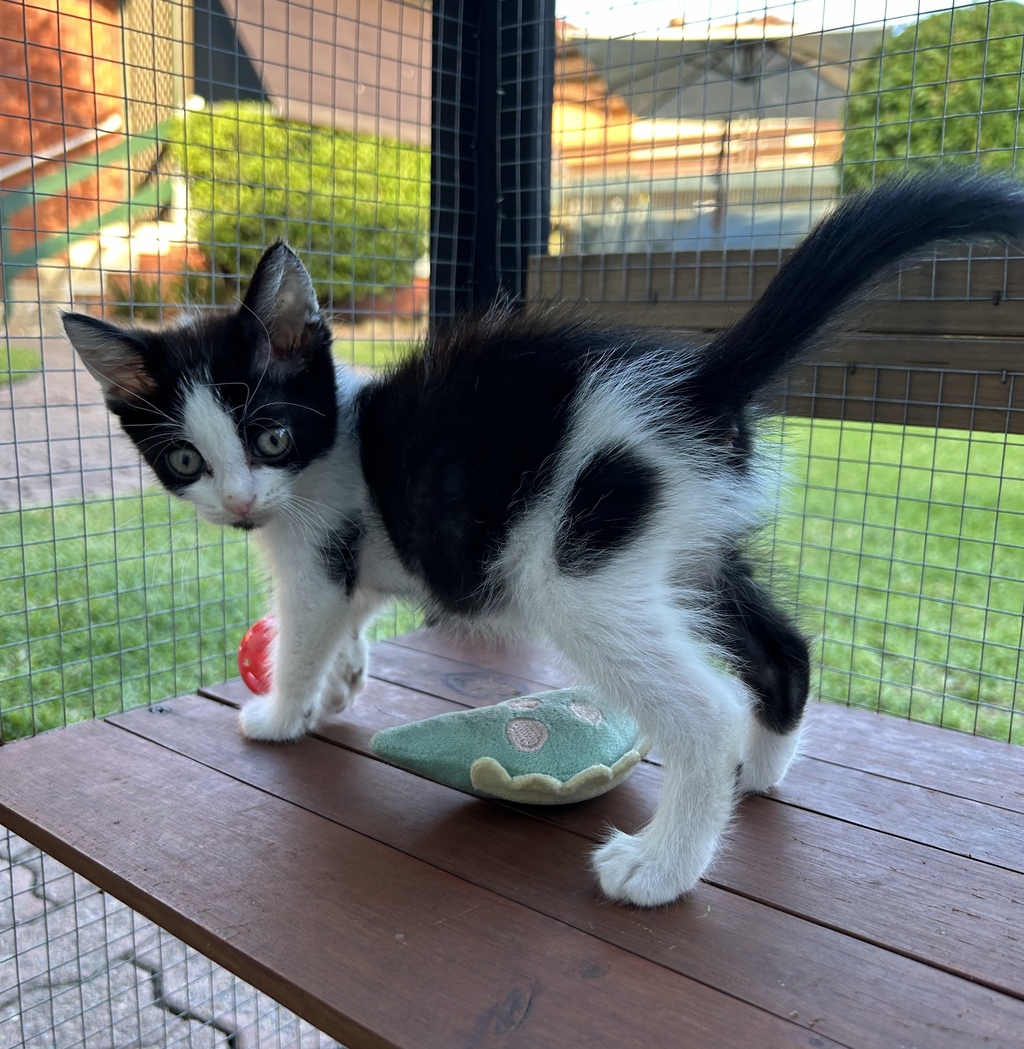 Drum Roll please.... introducing George Marble. George Marble was the runt of the litter (in his size only.) Faster than a speeding bullet, more powerful than a locomotive, able to leap tall cat trees in a single bound, there is nothing that George Marble can't do. Size to George does not matter, he gives as good as he gets from his larger litter mates. Play time being George's favorite time of the day. George may be small but he is mighty! Currently in foster care in western Sydney. Apply now to adopt George Marble.