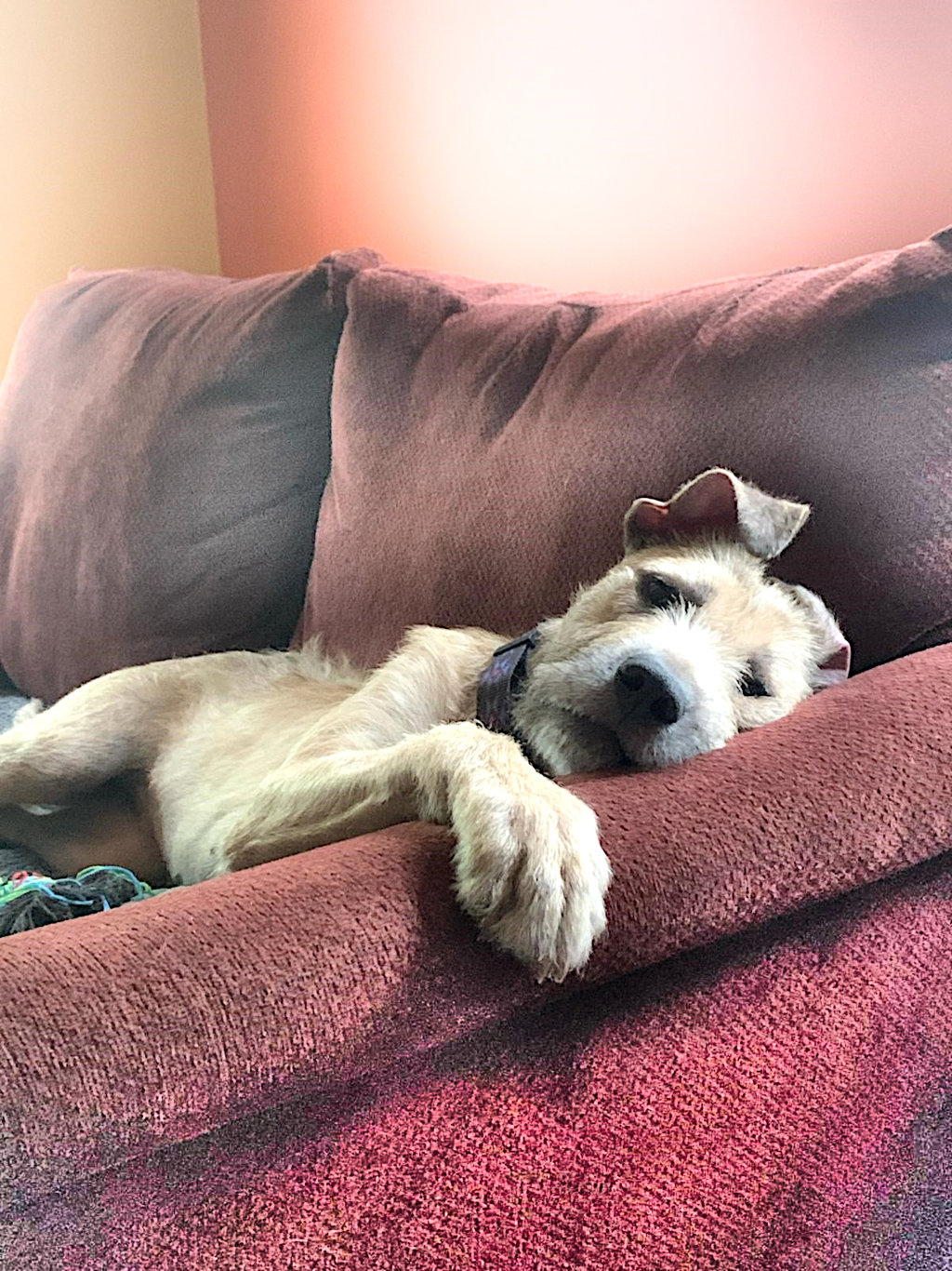 He loves his toys and play time, zoomies like a crazy dog, great in the car, loves his walks, thinks he's a lap dog, loves his food, reacts strongly to dog noises on the tele, still hates water (except to drink), still jumps up but improving, is getting heaps better when meeting other dogs on walks. He loves his Chihuahua playmate from down the street and keeps us on our toes and entertained.