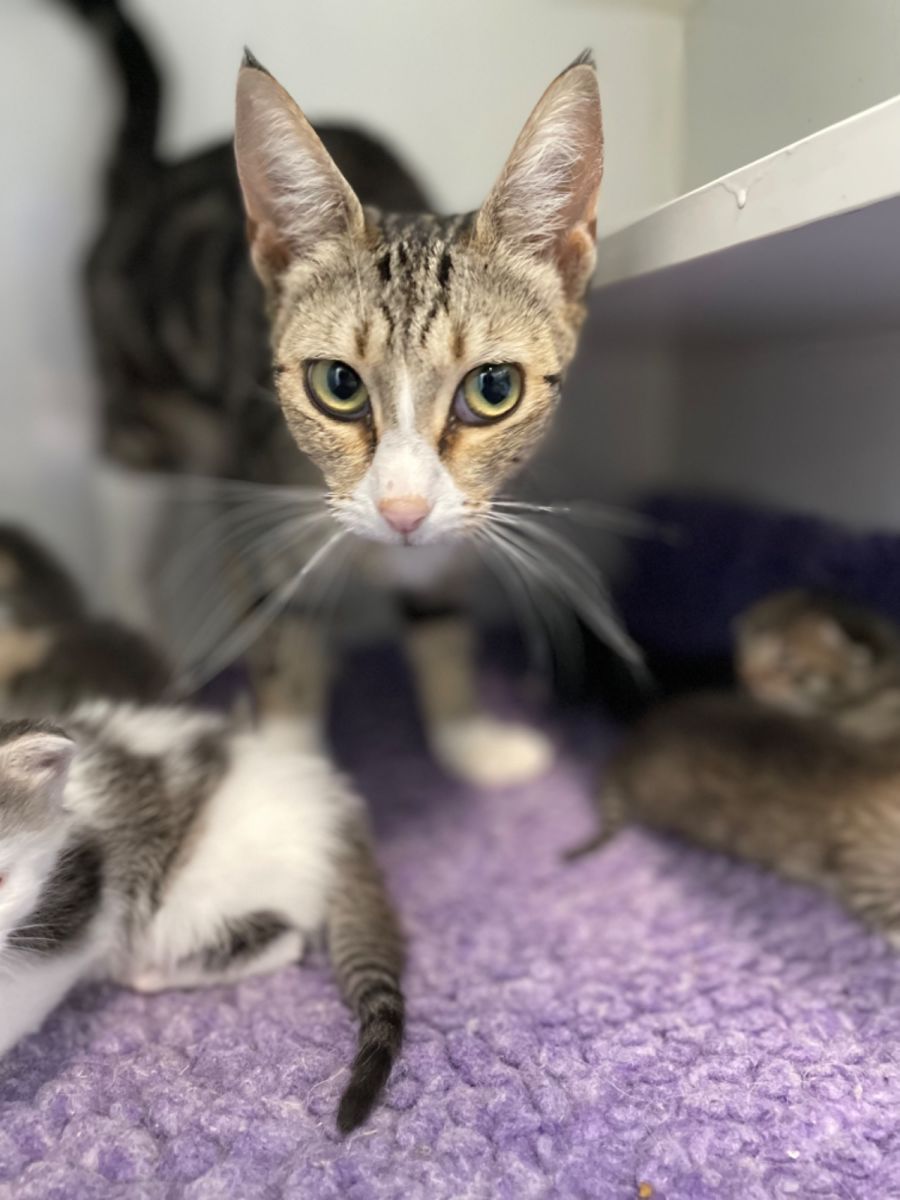Meet Tulip, a super sweet mama cat known for her loving and nurturing nature. Having done a remarkable job raising her six kittens and one foster kitten, this cat is a testament to motherly love and care in the feline world.
