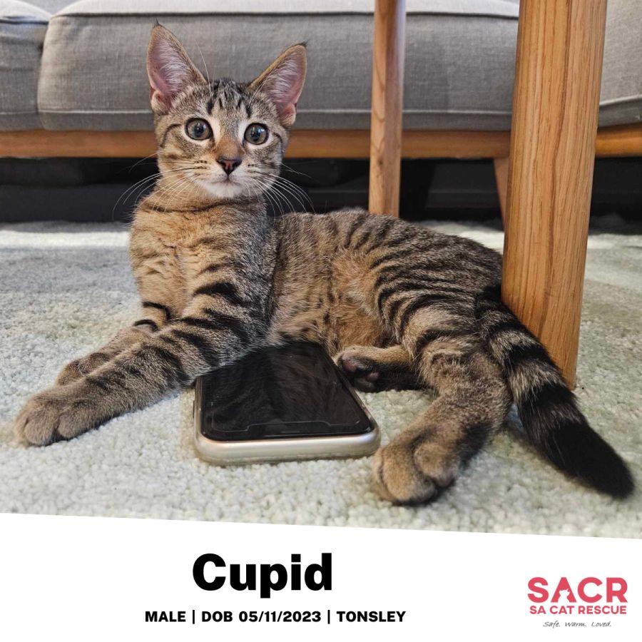 Cupid’s adoption fee is $180 which includes desexing, microchipping, parasite prevention, and initial F3 vaccination.