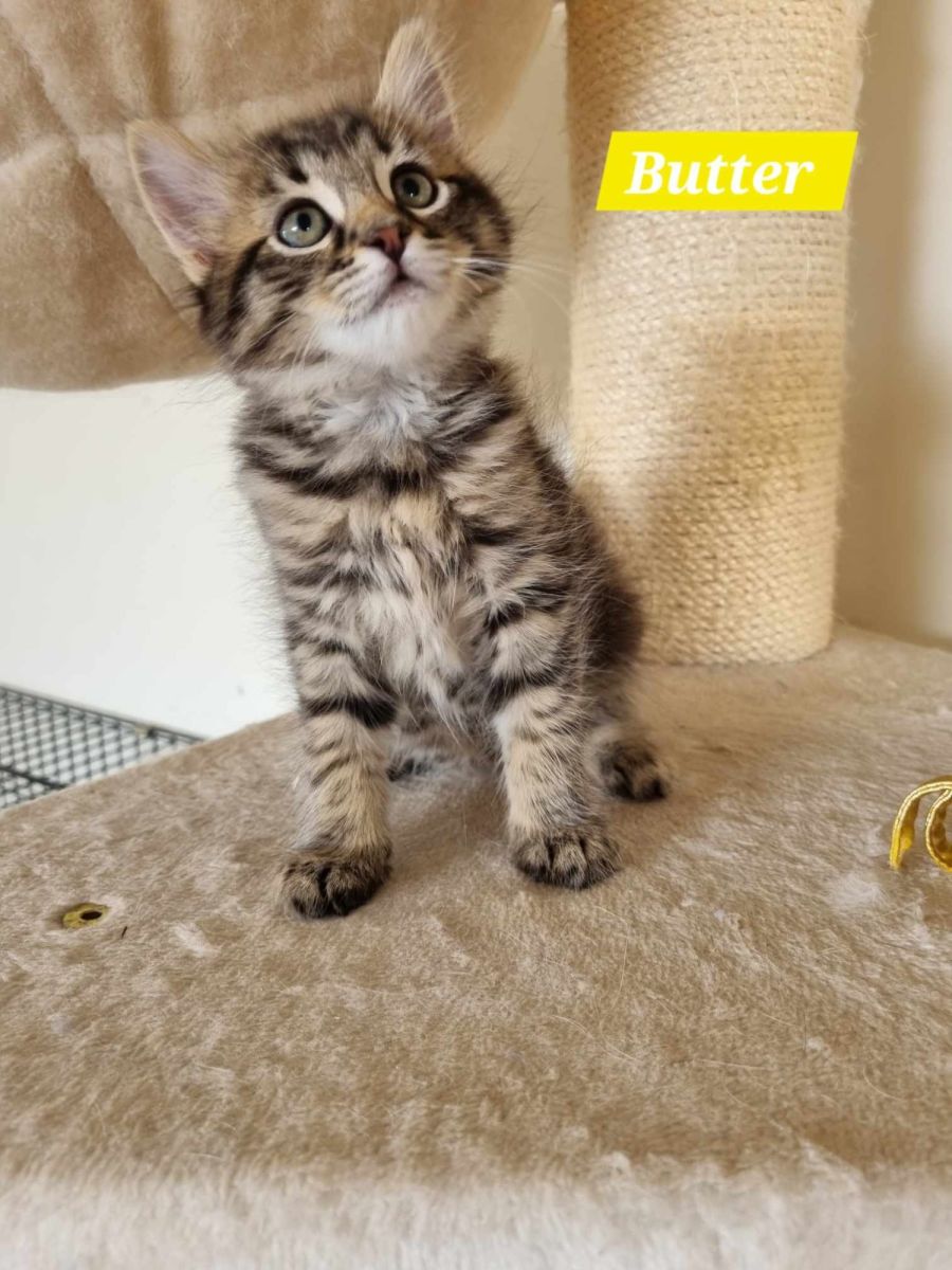 Butter loves playing with her siblings, racing around, and climbing the scratching poles.