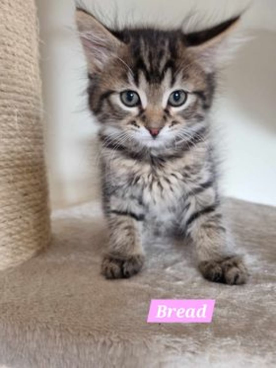 Bread loves playing with her siblings, racing around, and climbing the scratching poles.