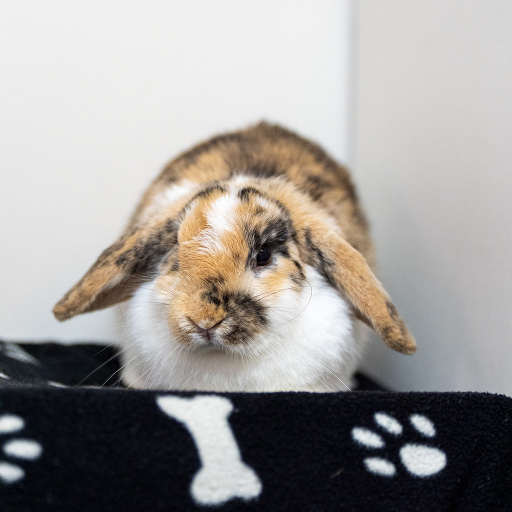Bruna is a stunning female rabbit with a coat that's a delightful mix of white and calico. She is a confident and friendly rabbit who enjoys interacting with her human friends. She's very handleable and loves nothing more than getting a gentle head scratch.